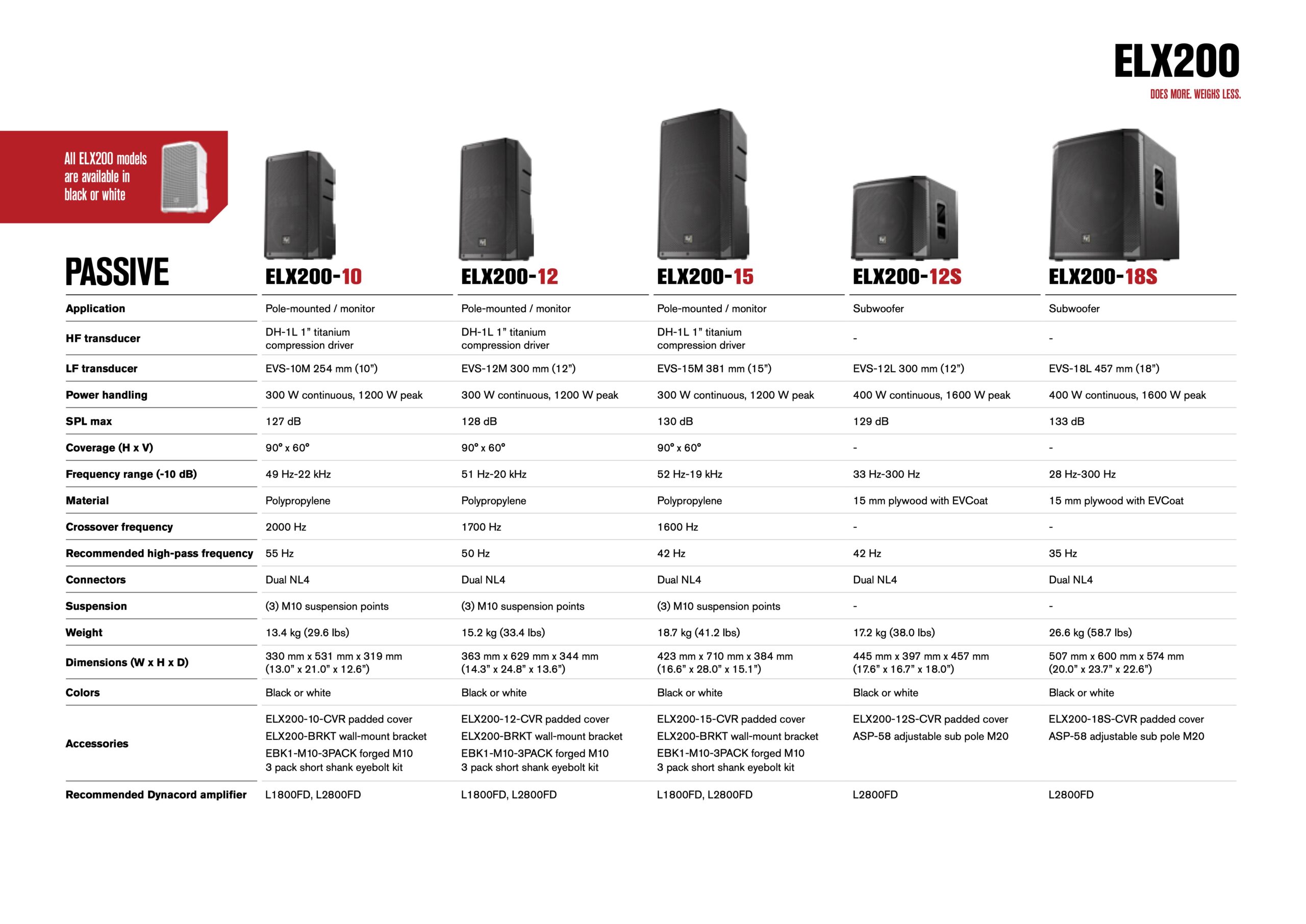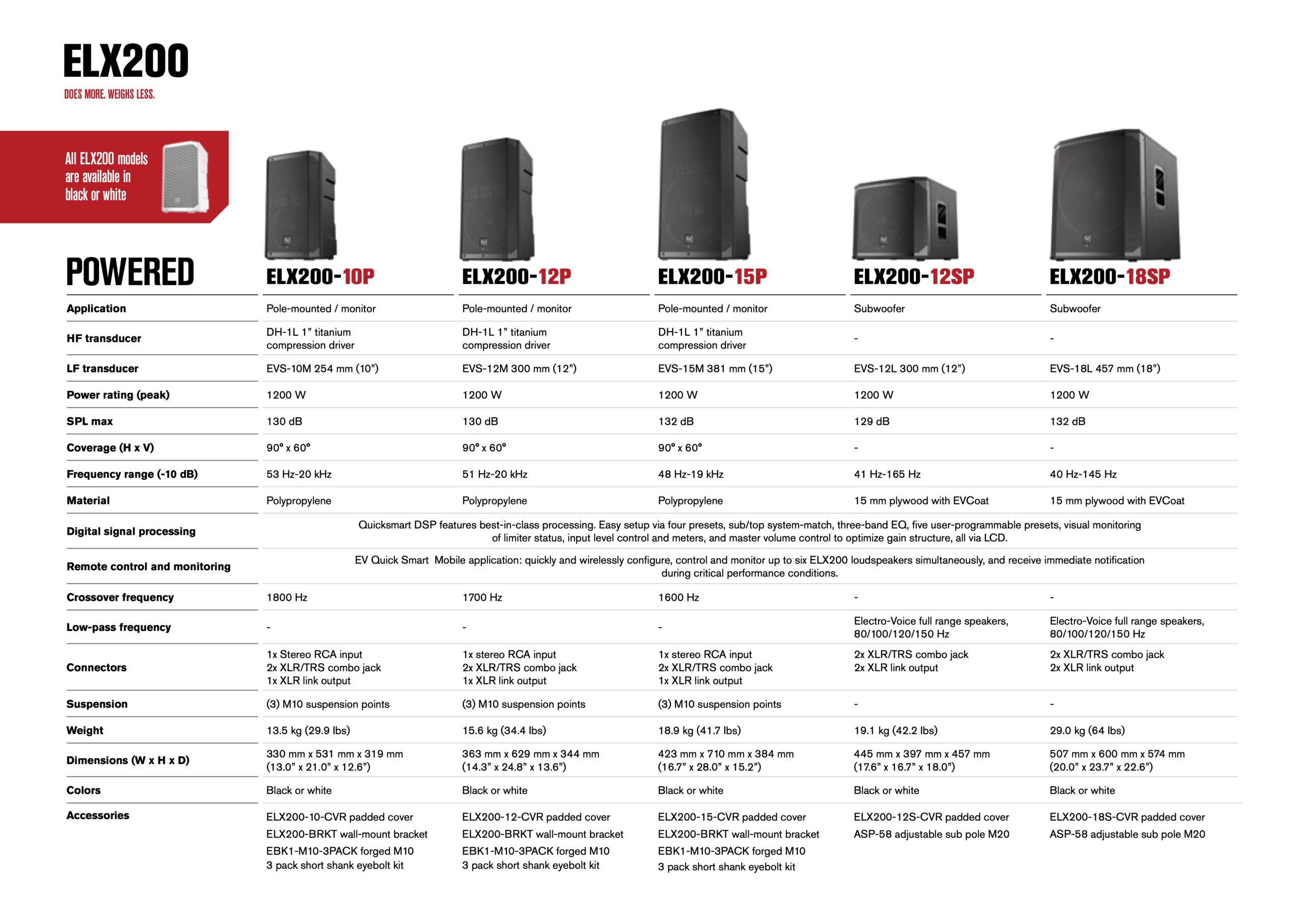 מארזי ELX200 זמינים בגימור שחור או לבן, מציעים עליית מדרגה הן בעיצוב והן באיכות הבנייה. דגמי הטווח המלא כוללים מארזי מרוכבים קלים וקומפקטיים עם חיזוק פנימי, שנועדו למזער תהודה ולהגביר את הקשיחות והחוזק. עם הסאב 18 אינץ' המופעל מעץ הקל ביותר בשוק, ושילוב מדהים של 10 אינץ' עליון / 12 אינץ' תת קומפקטי זמין לשרת מקומות קטנים יותר, יש אפשרויות זמינות לכל יישום. חומרה בדרגה מקצועית כוללת שלוש נקודות השעיה עם הברגה M10 לבריחי עיניים מזויפים, תושבות מוטות משולבות ועיצוב שלוש ידיות המוכח שלנו להרמה קלה.