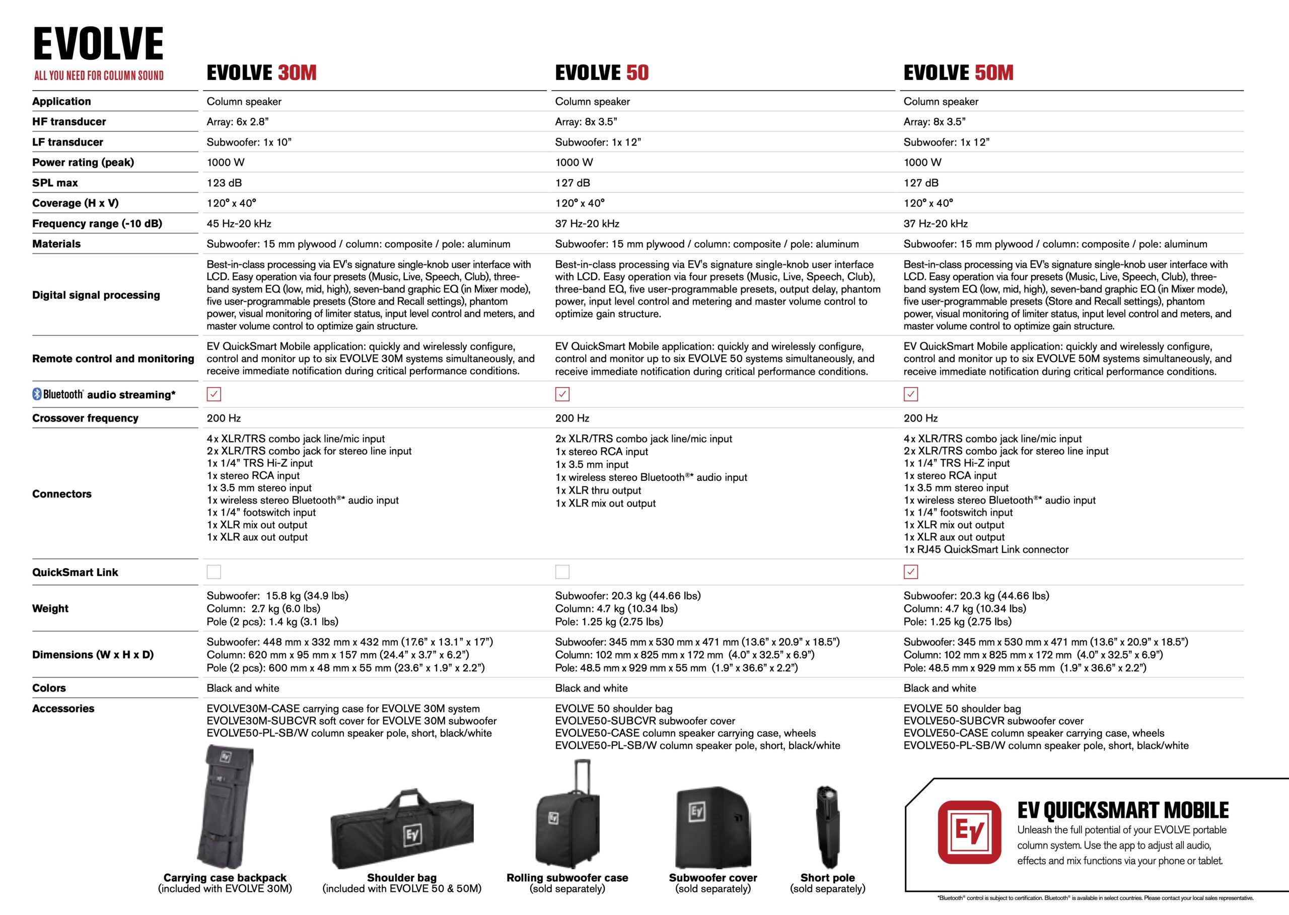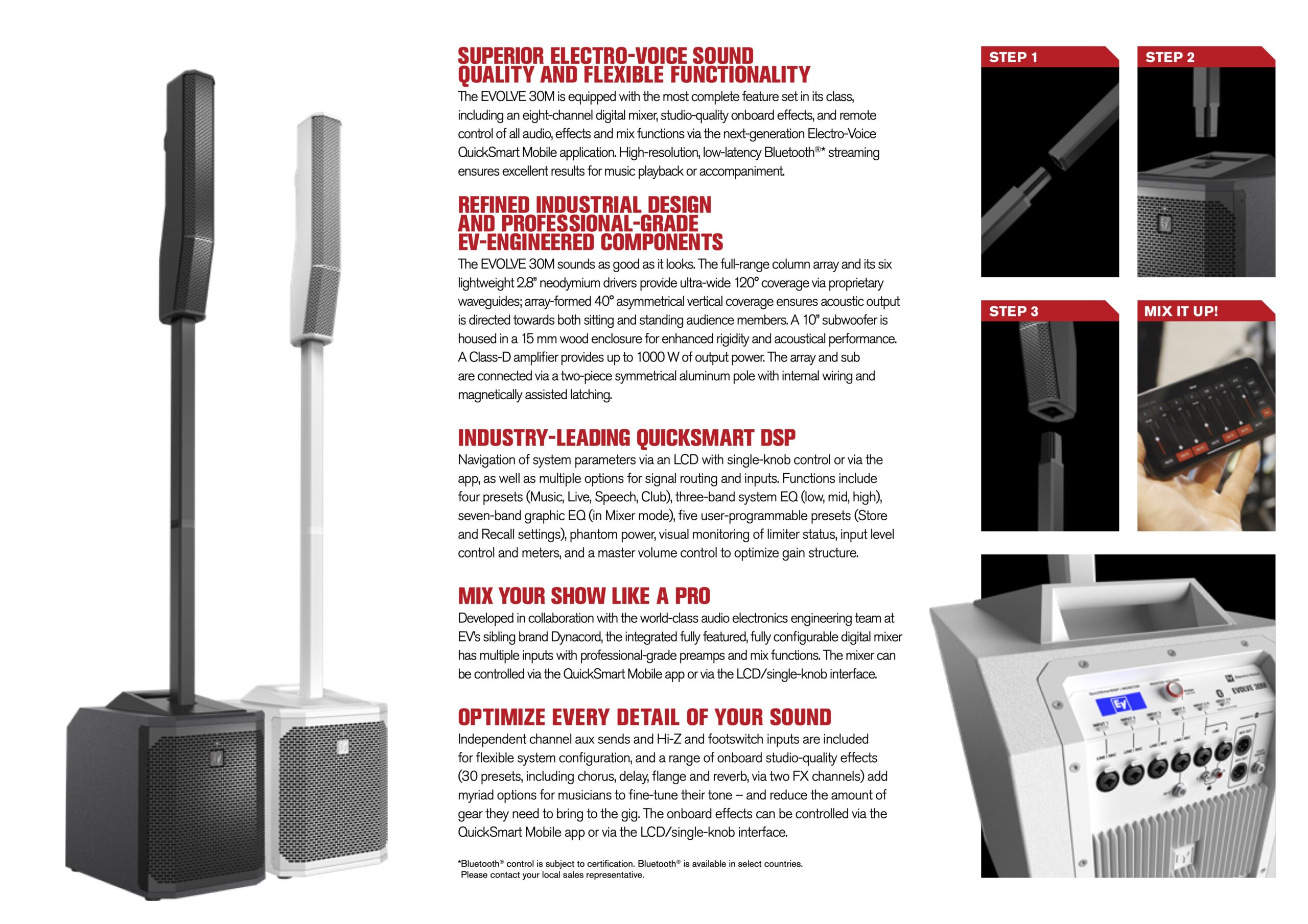 ה-EVOLVE 30M נועד לספק עליית מדרגה משמעותית בביצועים הכוללים עבור מערכת קולונה בקטגוריית הגודל/מחיר שלה. הוא כולל מיקסר דיגיטלי בעל שמונה ערוצים, אפקטים מובנה באיכות אולפן, ושליטה מרחוק על כל פונקציות האודיו, האפקטים והמיקס באמצעות הדור הבא של אפליקציית Electro-Voice QuickSmart Mobile (זמינה דרך Apple Store וב-Google Play).