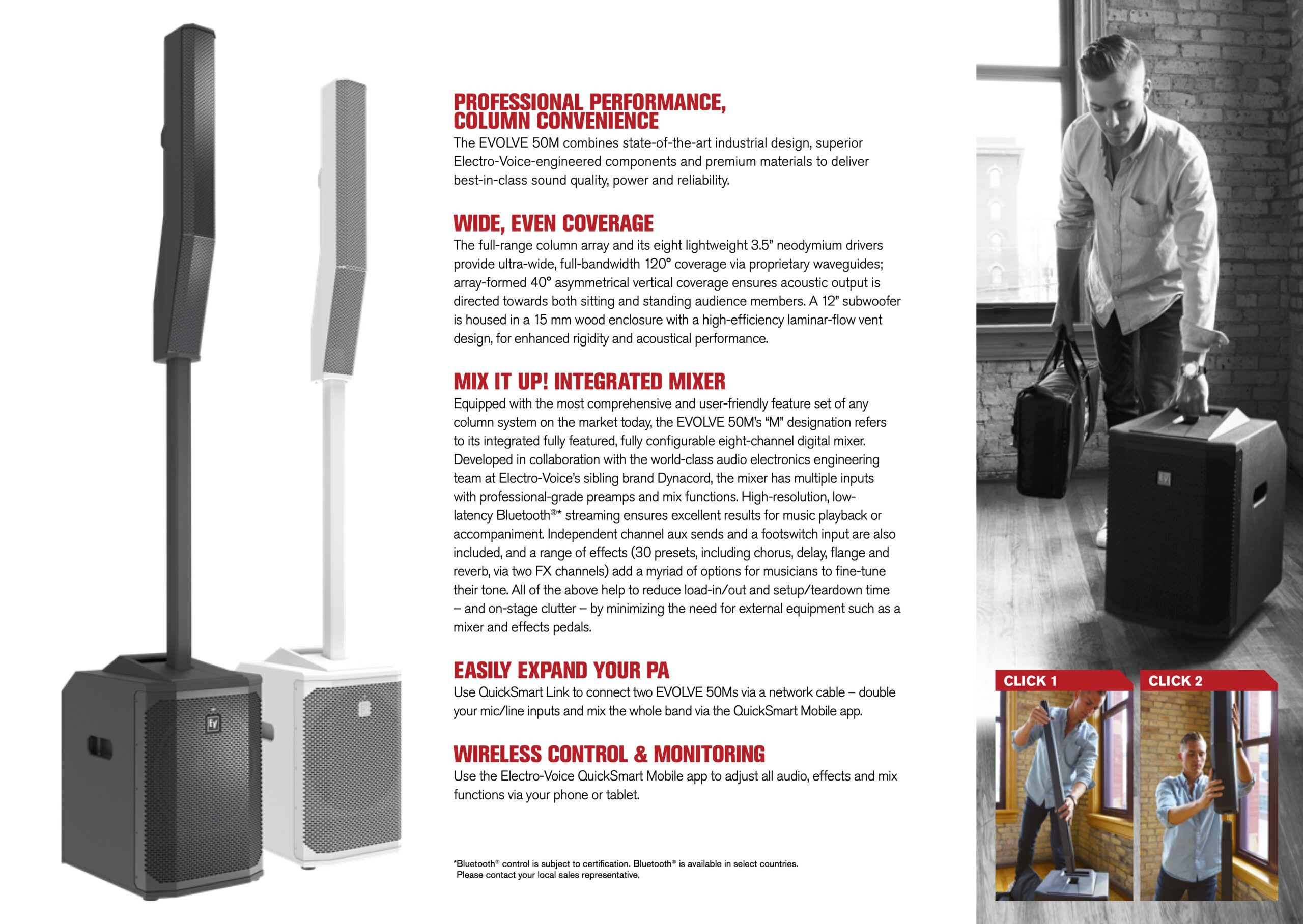 Electro-Voice מרחיבה את סדרת ה-EVOLVE המובילה בתעשייה עם השקת מערכת הרמקולים העמודה EVOLVE 50M. ה-EVOLVE 50M כולל את טכנולוגיית השמע והבקרה הדיגיטלית QuickSmart Link החדשה של ElectroVoice, מיקסר מובנה, DSP ואפקטים – כולם משולבים בפורמט ה-EVOLVE 50 המלוטש. ה-EVOLVE 50M הוא הבחירה המושלמת עבור להקות/מוזיקאים, חברות השכרת AV, תקליטנים וכל אפליקציה שבה נדרשת ביצועי שמע מקצועיים אמיתיים בחבילה סופר קומפקטית וניידת.