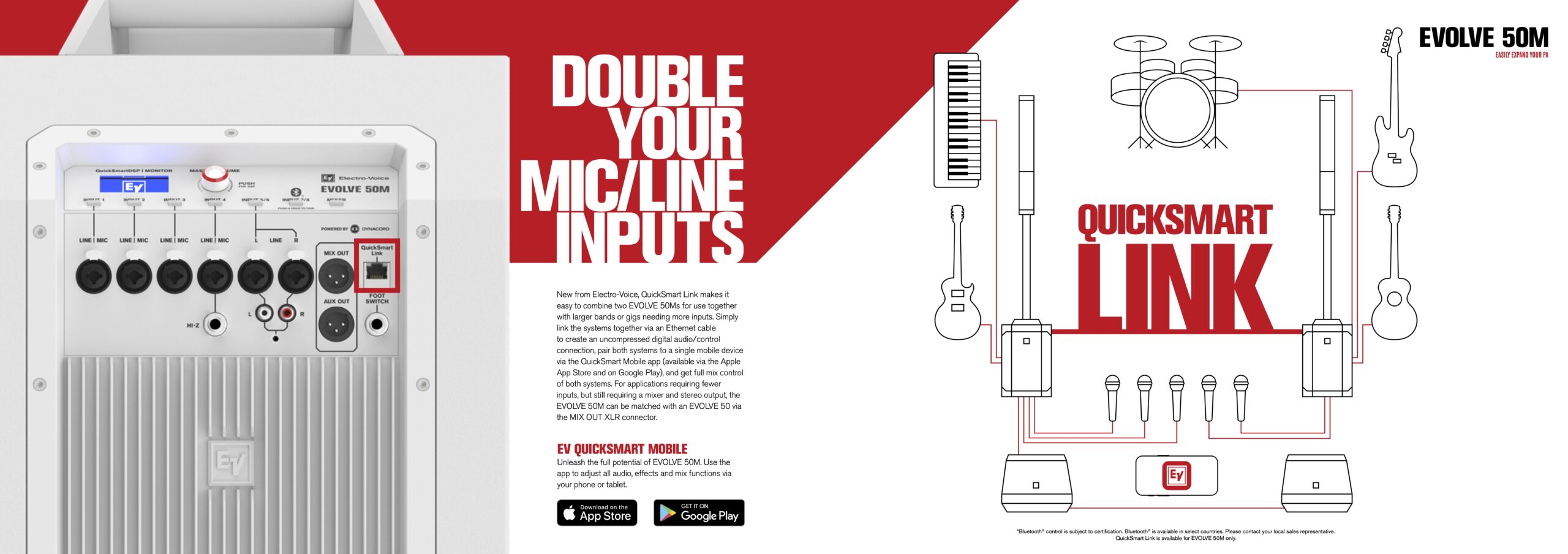 חדש מ-Electro-Voice, QuickSmart Link מקל על שילוב שני EVOLVE 50Ms לשימוש יחד עם להקות גדולות יותר או הופעות הזקוקות ליותר כניסות. כל שעליך לעשות הוא לחבר את המערכות יחד באמצעות כבל Ethernet ליצירת חיבור אודיו/שליטה דיגיטלי לא דחוס, צמד את שתי המערכות למכשיר נייד יחיד באמצעות אפליקציית QuickSmart Mobile (זמינה דרך Apple App Store וב-Google Play), וקבל שליטה מלאה במיקס. של שתי המערכות. עבור יישומים הדורשים פחות כניסות, אך עדיין דורשים מיקסר ויציאת סטריאו, ניתן להתאים את ה-EVOLVE 50M ל-EVOLVE 50 באמצעות מחבר MIX OUT XLR.