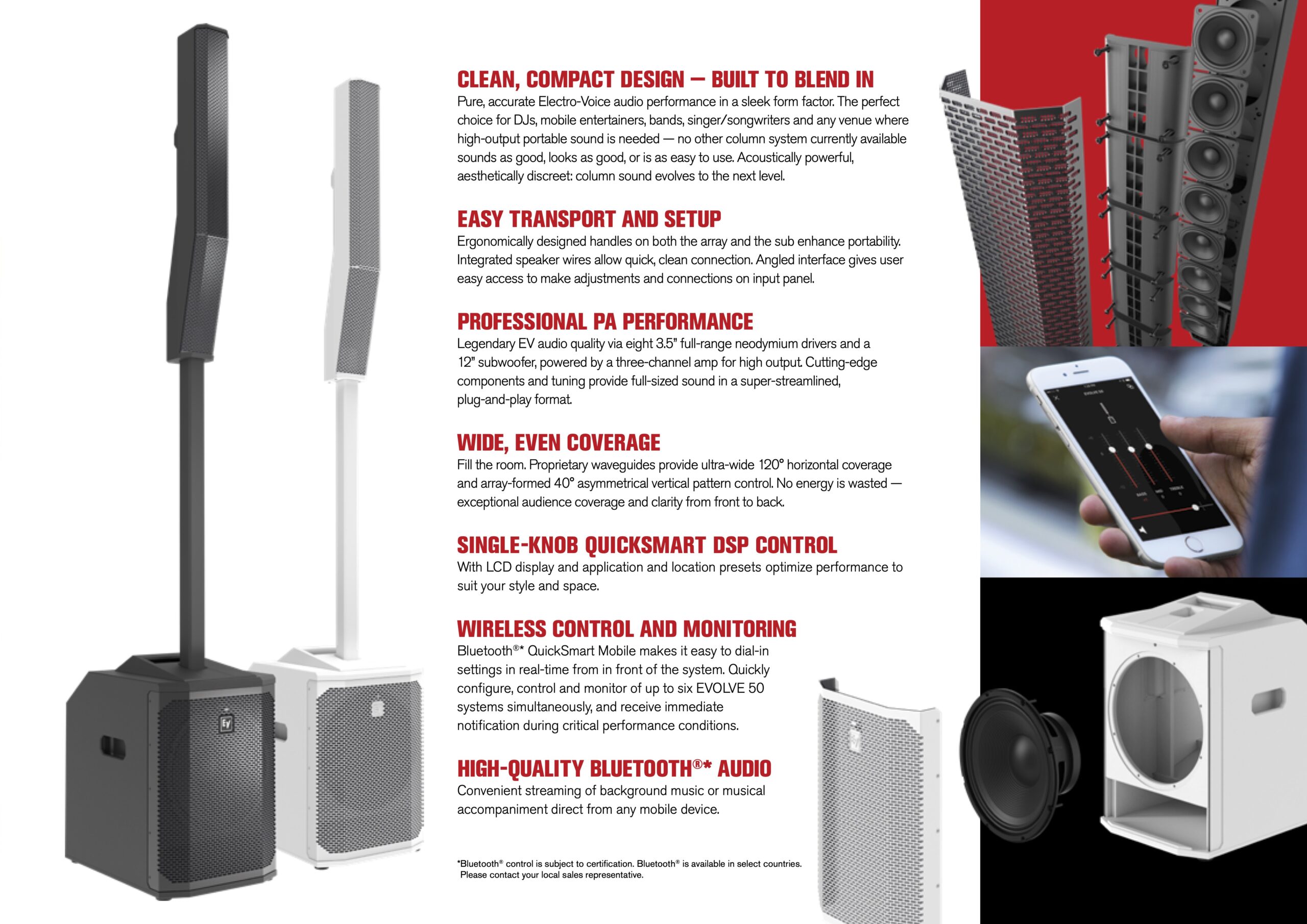הבחירה המושלמת עבור תקליטנים, בדרנים ניידים, להקות, זמרים/כותבים, וכל מקום בו יש צורך בסאונד נייד עם פלט גבוה – אין מערכת עמודות אחרת הזמינה כרגע נשמעת טוב, נראית טוב או קלה לשימוש. הבהירות החלקה של צליל ה-EV בגורם צורה חדש ומלוטש.